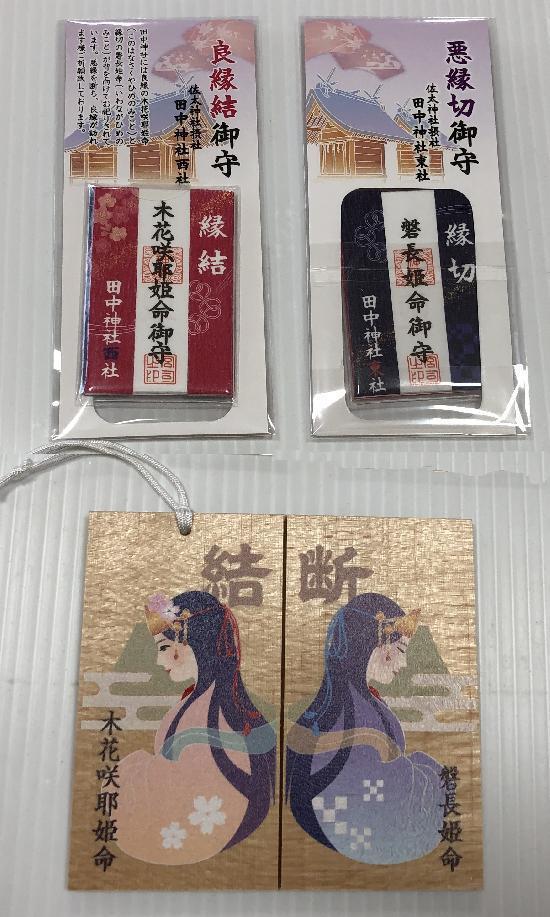 佐太神社摂社 田中神社の御祭神 木花開耶姫命 磐長姫命にまつわる悪縁を絶って良縁を結ぶご利益を授かりましょう。 このお二柱の女神様は北殿の御祭神 瓊瓊杵尊のお妃様で 妹の木花開耶姫命は花のように美しく、姉の磐長姫命は容姿が醜く親元へお返しになった事から 縁切のご利益があるとされています。 御守りは縁切守りと縁結び守りが裏表になっております。 祈願割符は裏面に願主様の名前を記し、願をかけて二つに割ります。